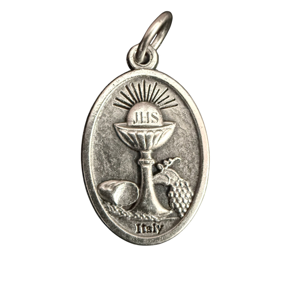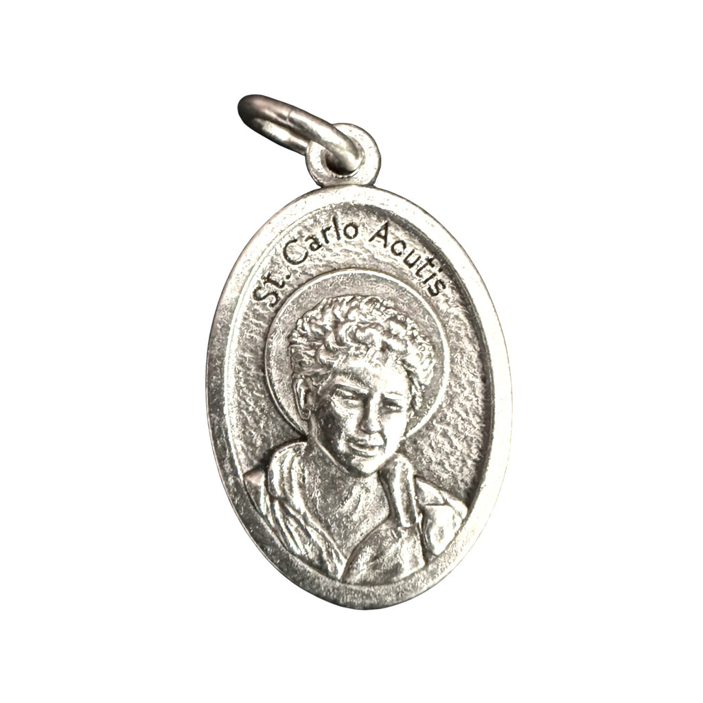 The centerpiece features an authentic Italian medal of Blessed Carlo Acutis, showing his portrait on the front and a Eucharistic chalice with grapes on the back - a timeless symbol of the Holy Eucharist and divine grace.