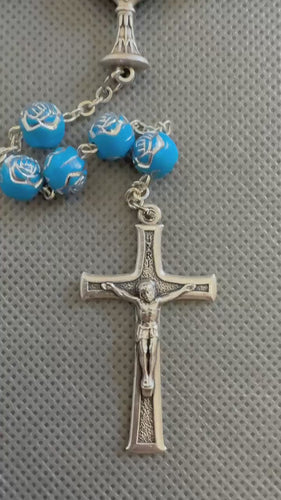 This unique rosary is carefully handmade with blue rose-shaped beads, a symbolic tribute to the Virgin Mary and the beauty of prayer.