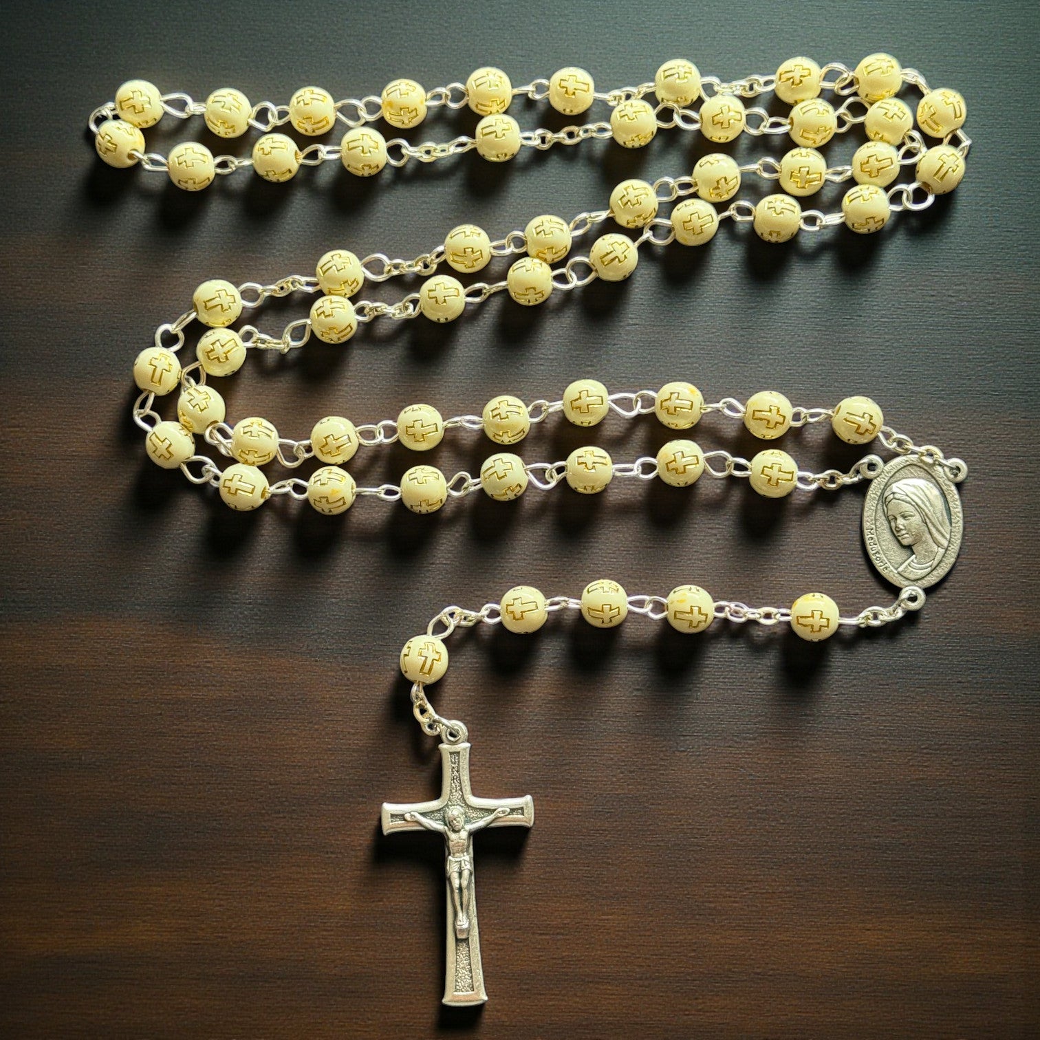 Each rosary is made with care and devotion, featuring cream-colored beads engraved with golden crosses, symbolizing purity, faith, and peace.