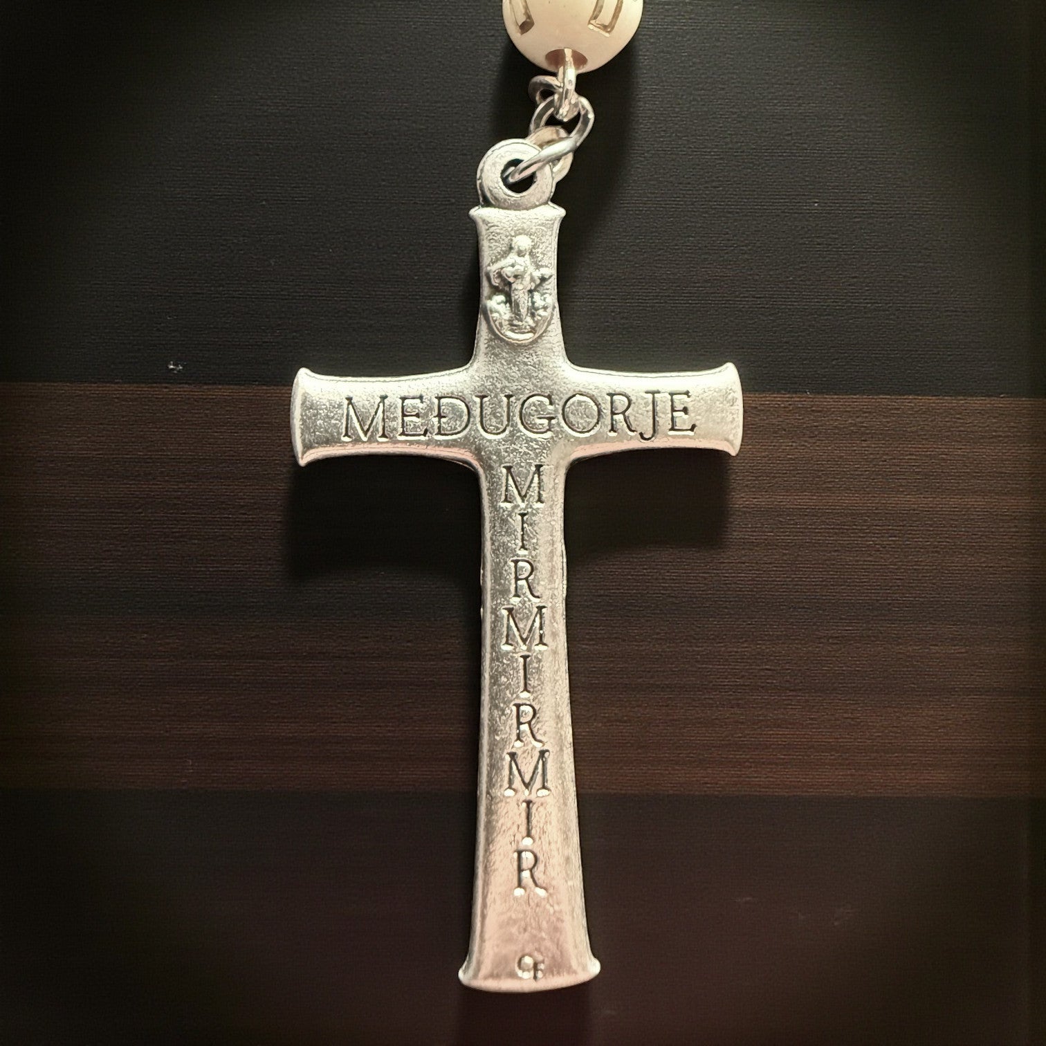 • Authentic Medjugorje Crucifix - Detailed silver-tone crucifix engraved with “Medjugorje MIR” (meaning Peace in Croatian).