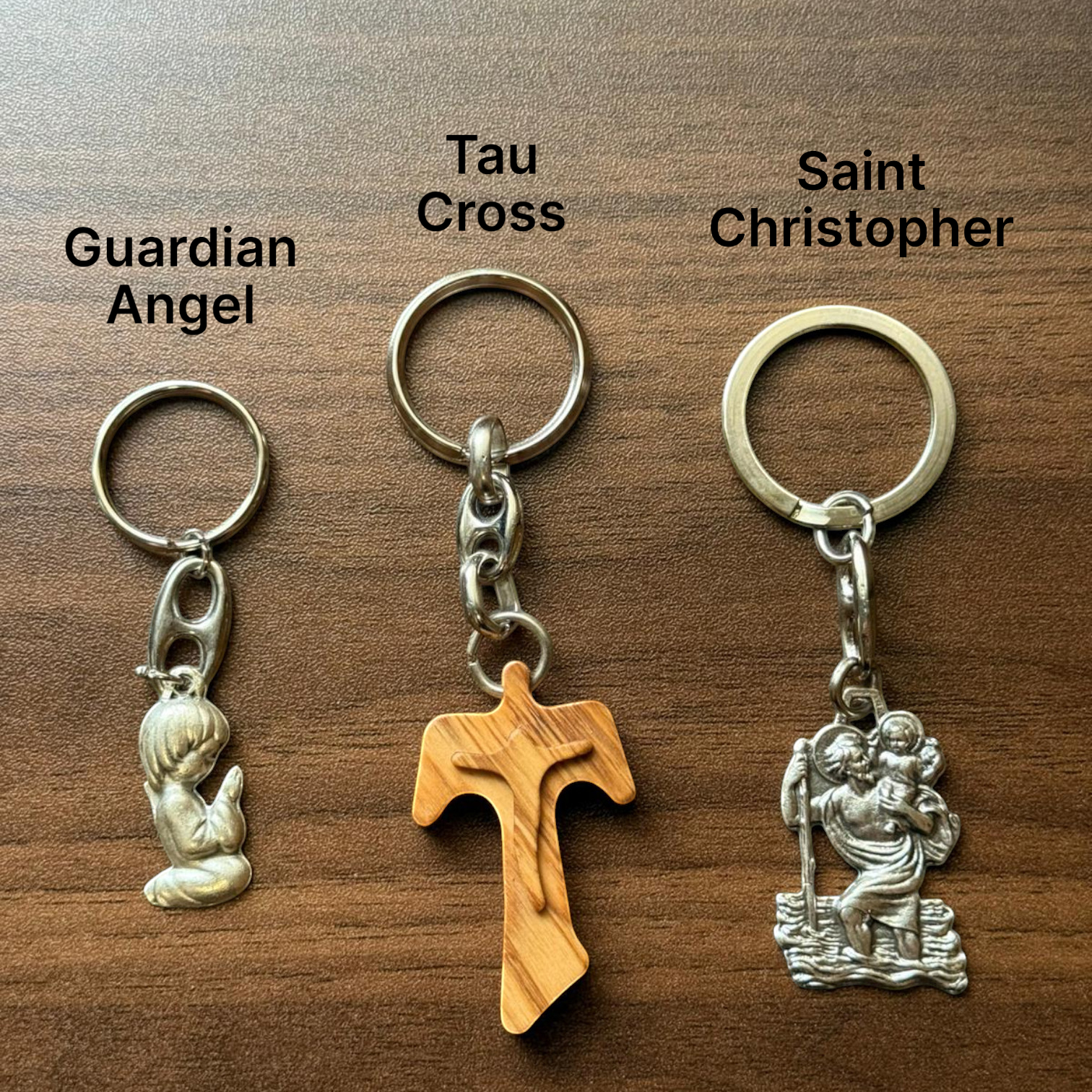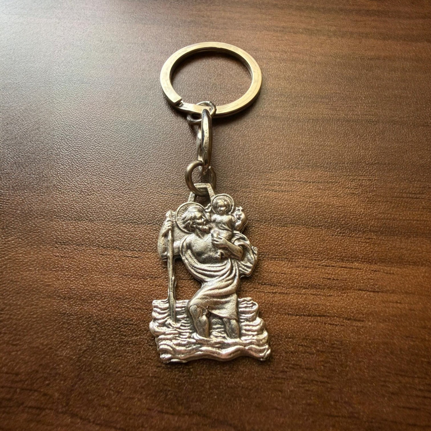 St. Christopher carrying the Child Jesus, known as the patron saint of travelers and drivers. A popular choice for car keys and journeys.